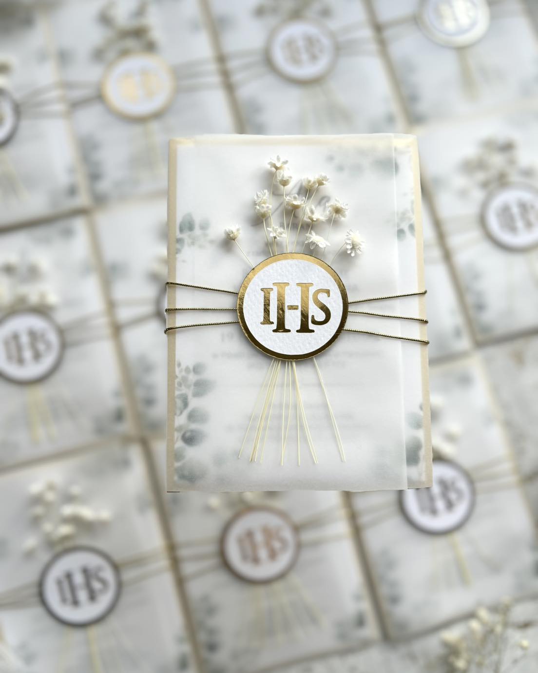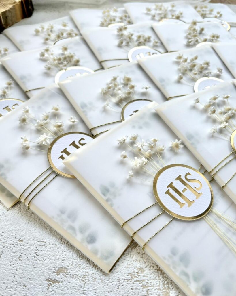 Treść otulona kalką i delikatnym sznureczkiem, emblematem tematycznym lub stemplem oraz z subtelnym dodatkiem suszków dodających elegancji całej kompozycji.
