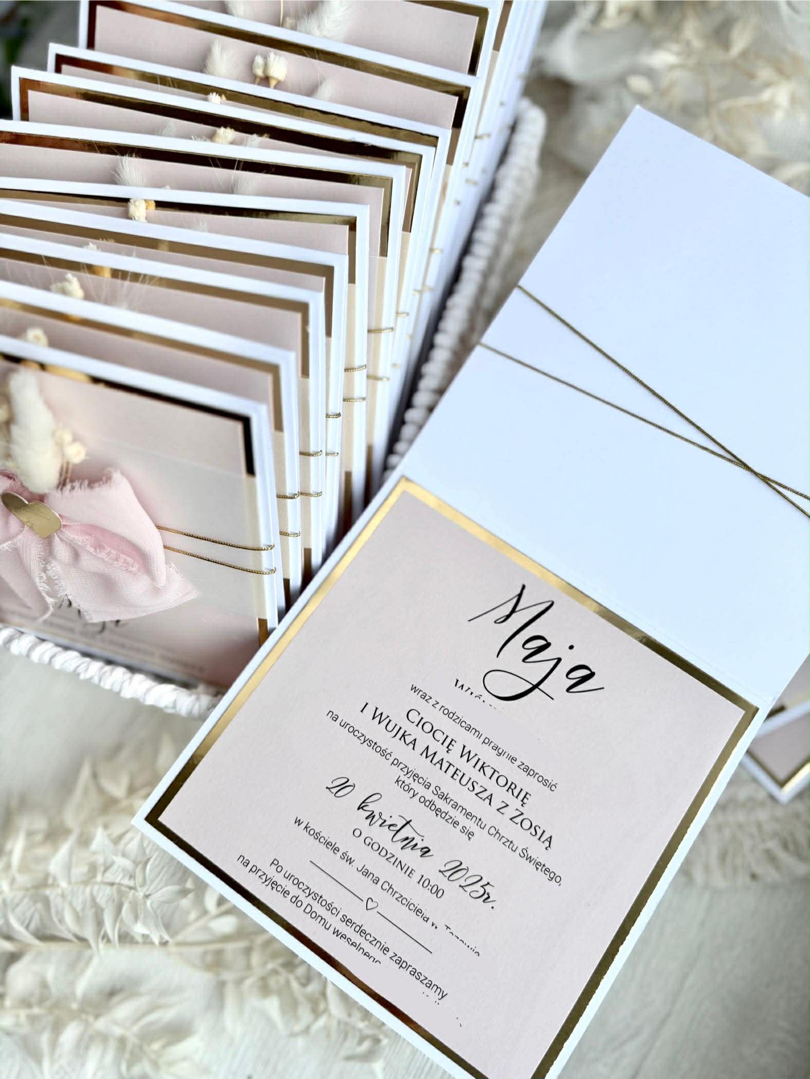 Minimalna ilość zamówienia dla zaproszeń to 10 sztuk. Zalecam uwzględniać zaproszenia zapasowe/wykropkowane ( do uzupełnienia danych gości) ponieważ nie ma możliwości dorabiania pojedynczych sztuk.